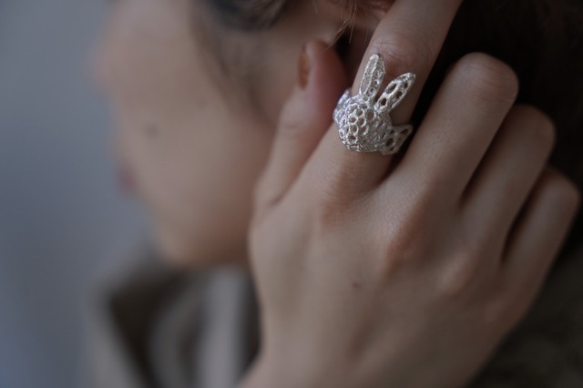 『心が穴だらけだ って気付いたも その心で叫べはいいと思う 穴だらけだからこそ その心は叫べばいいと思う』 ウサギのモチーフに穴を開けレース状に。 凹凸のある表面の加工がキラキラと光ります。 ボリュームがありながら軽い着け心地のリングです。 素材:シルバー 一点一点手作業にて制作しております。 風合い、色、形など微妙に異なります事ご了承ください。 ご注文の際に、備考欄にご希望の号数をご明記ください。(#7~#23) ご希望のサイズの完成品在庫がございました場合は一週間以内に発送致します。 それ以外は受注生産となっておりますので二週間〜一ヶ月ほどお時間いただきますのでご了承下さい。 お急ぎの方はお気軽にお問い合わせ下さい。 HOASHIYUSUKEのアクセサリーは大変繊細なものとなっております為、引っかかりなどにご注意下さい。
